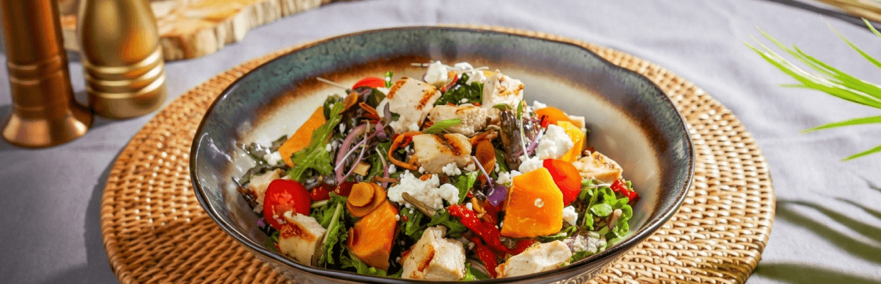 Tossed salad of beluga lentils, kale, lettuce, sweet potato, cherry tomatoes, sun-dried tomato, goat cheese, roasted almonds, and onion tossed in homemade citrus-lime vinaigrette & topped with grilled chicken.